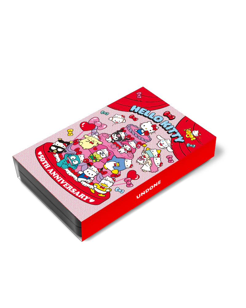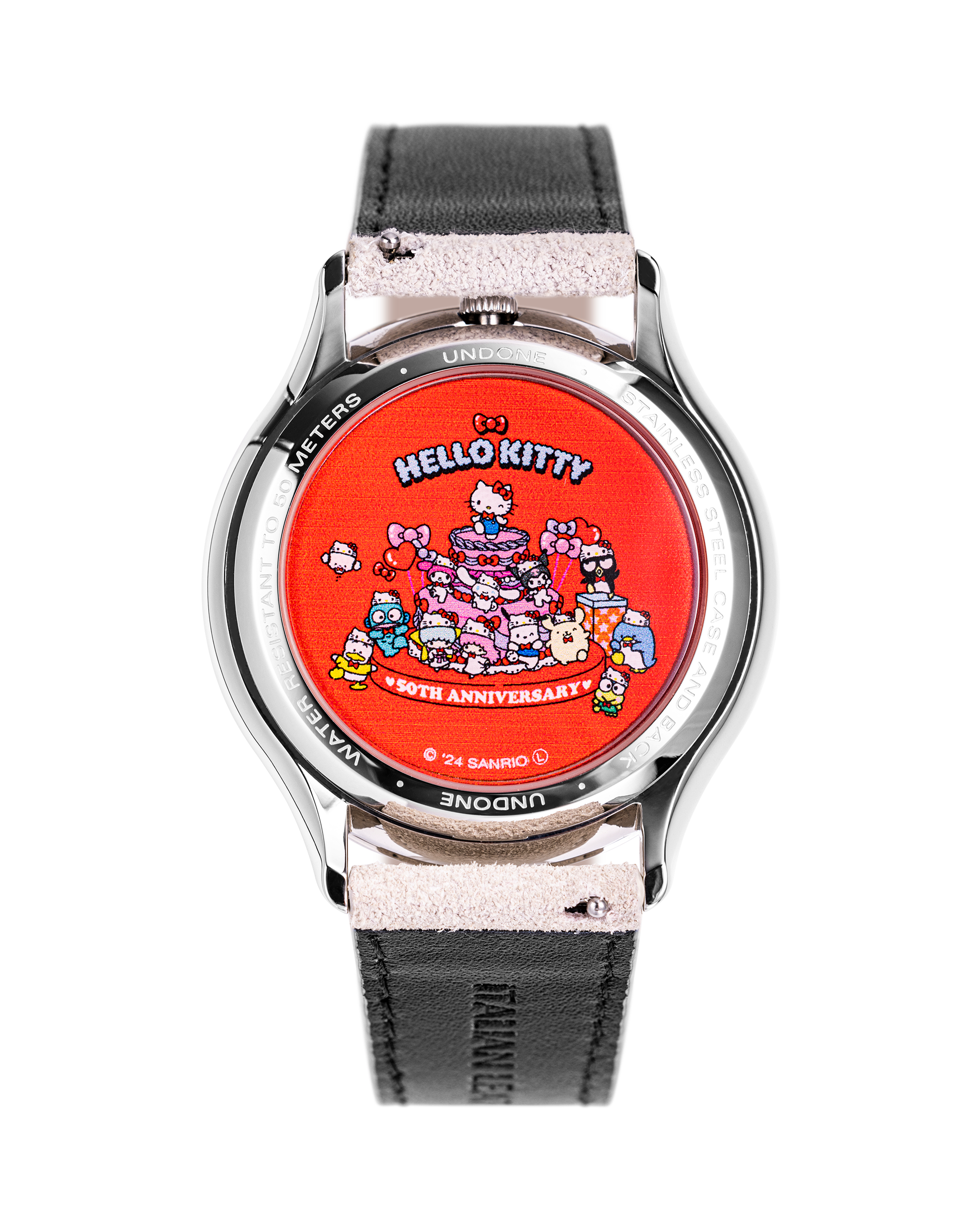 Commemorate Hello Kitty’s 50th birthday with this special quartz watch! The dial features Sanrio characters rocking a “Hello Kitty Hat” and a cute disc-shaped second hand shaped with Hello Kitty soaring through the air. Flip it over to see a special 50th-anniversary design on the case back.